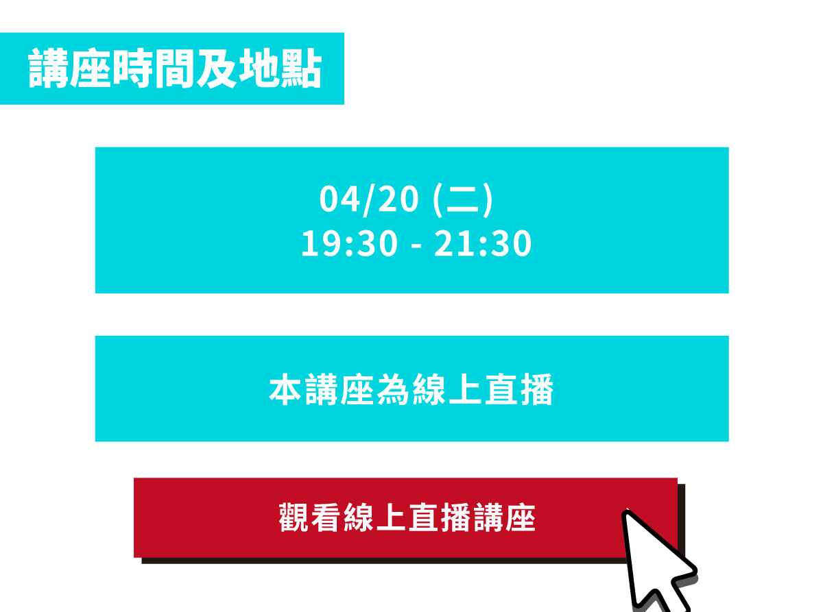 線上直播學習影片僅保留 7 天,建議可在課程時間同時觀看,才可以參與課程隨時跟老師 QA 問問題喔!部分課程僅開放直播不保留影片,提供課程連結時會同步說明。