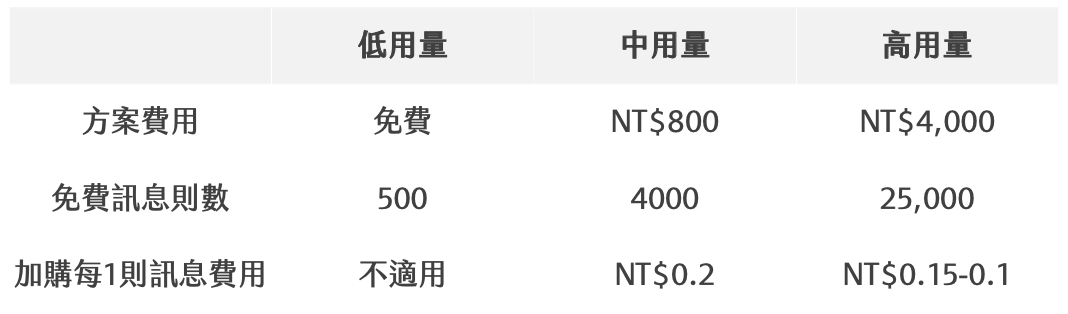 中用量用戶免費訊息 4000 則,800 元;剩下的 10000 則訊息每則 0.16 元