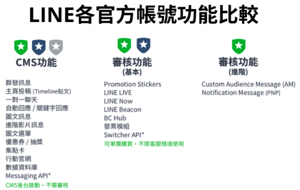 而在認證帳號(藍色)與企業帳號(綠色)的主要功能差異則是認證帳號和企業帳號在串接與行銷上可以更彈性化,建議若有積極想要經營 LINE 的品牌務必申請 LINE 的認證帳號。