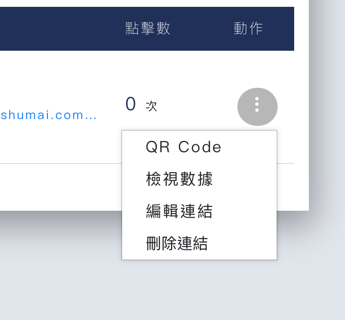 動作的選單總共有四種,分別是:「QR CODE、檢視數據、編輯連結、刪除連結」。