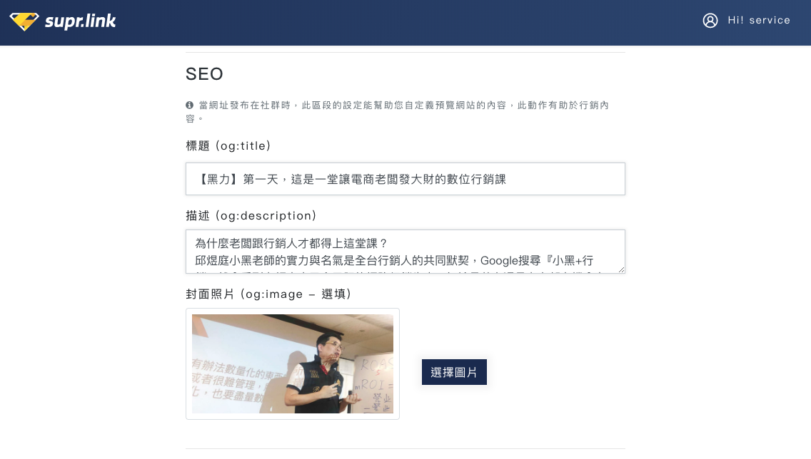 這段設定除了字面上「搜尋引擎優化」的用處以外。當網址發布在社群時,此區段的設定能幫助您自定義預覽網站的內容,如:FB的縮圖與標題說明。