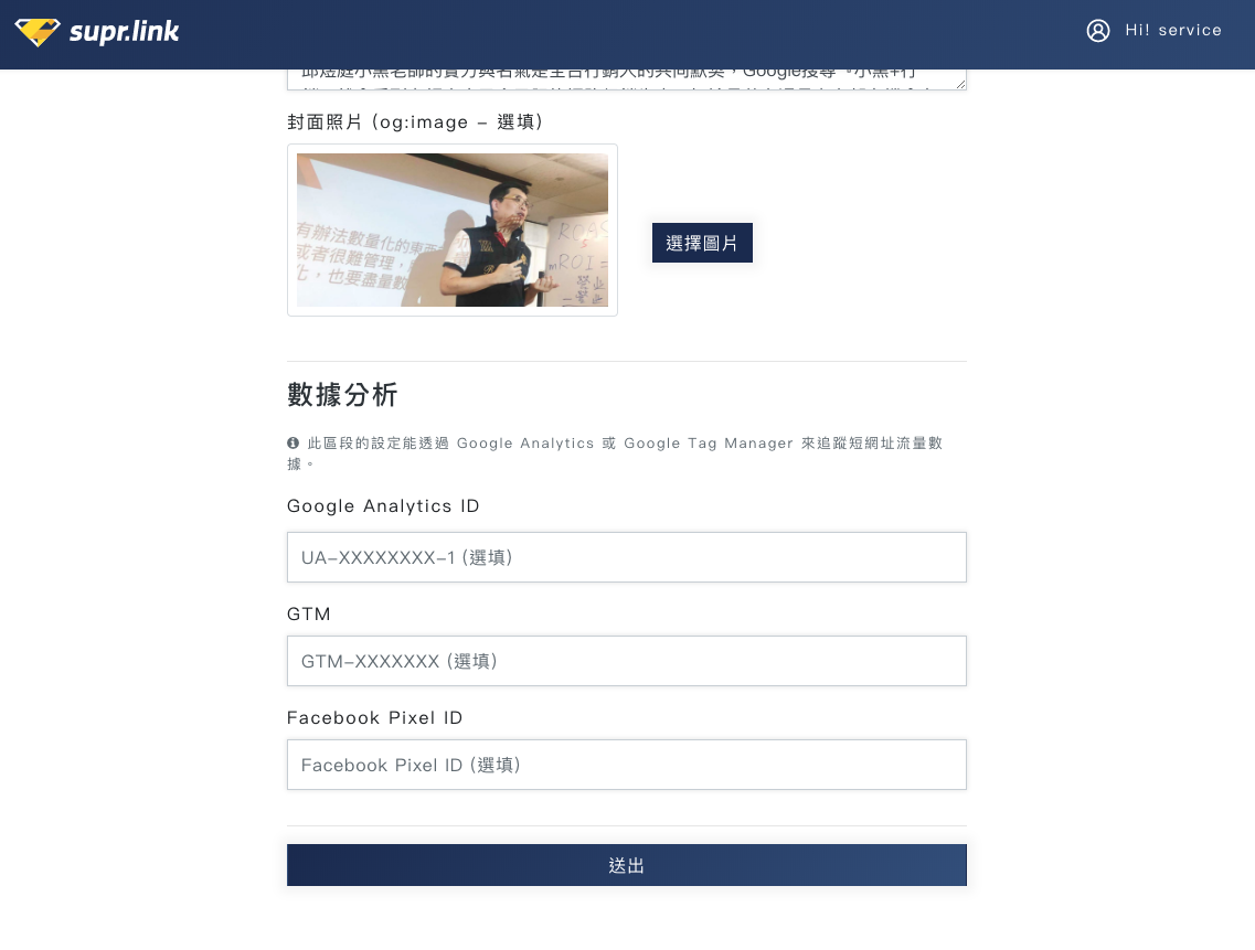 是為了追蹤各種活動成效所需的設定。 在這邊我們只要照著填入,SuprLink就會自動帶入網址囉。