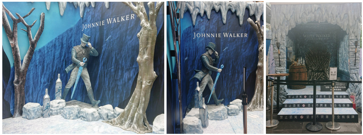 又或者是2018年冬天, Johnny Walker 和影集冰與火之歌聯名出限量款,在信義區做了實體快閃店,有特殊的場景佈置供影迷或路人們拍照打卡,在晚間特殊時間點才營業、一天限量10瓶販售聯名款商品。