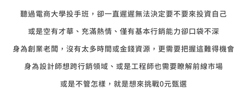 我們提供學程式學習,當您已身為數位行銷老手或是創業老闆,基礎技能操作沒有問題,但在數位行銷執行上的營收成效無法大幅提升,甚至期待自己能夠躍升為行銷顧問或是急欲提昇營收,1.5~2個月學程式學習能利用大規模的產品上市行銷操作讓您學習實作,燒賣講師顧問團更於課程中給予您整合性運營策略及更多實戰操作經驗,讓您將所學完整運用達到行銷成果。