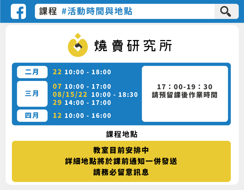 請於課前通知燒賣研究所Ava 0919-635091,您可將報名名額轉送他人(須提供被贈者之姓名/電話/Email)或保留至下一梯次再參與。