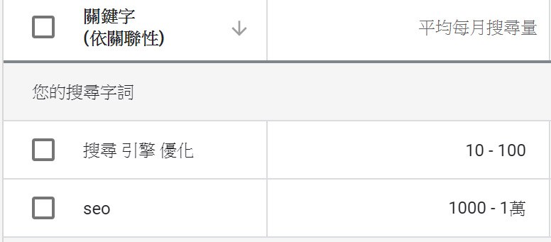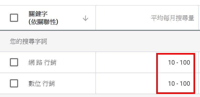 一般來說,我們會仰賴分析工具來整理搜尋量的資料,這樣的工具使用上非常容易,大多的工具都是在你輸入特定關鍵字之後,工具就會呈現給你"平均每月的搜尋量"(文章後段我會介紹常見以及好用的工具),以上圖來說,我在Google Ads的關鍵字規劃工具內輸入"網路行銷",他就會呈現給我知道,網路行銷這組關鍵字的搜尋量為:平均每個月10-100,這也意味著平均每個月有10-100次搜尋行為是搜尋這組關鍵字的。