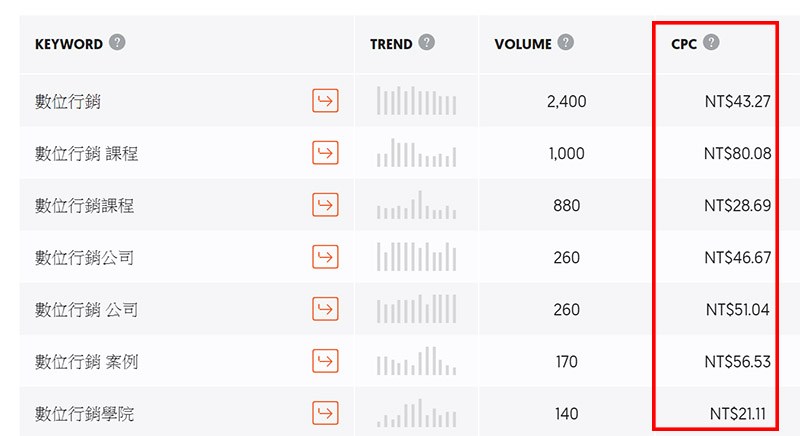 通常關鍵字分析工具都會帶有 CPC這個指標,關鍵字的CPC(平均每次點擊為多少錢)、搜尋量、競爭度我們都會綜觀的一起看,因為每一組關鍵字的單次點擊出價為多少意味著市場上有多少競爭對手有在購買這組關鍵字,簡單來說也就是代表著"關鍵字廣告的競爭狀況"。