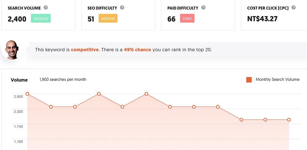 Ubersuggest是行銷大師 Neil Patel所開發的SEO工具,他使用上非常非常簡單,只要在工具上輸入你想知道的關鍵字數據、以及選擇所在搜尋引擎,就會有報表跟數據出現,數據報表內除了搜尋量之外,還會提供"關鍵字競爭度"以及"搜尋趨勢",也因為這個工具使用起來容易、再加上完全免費(連註冊都不用),因此通常我都是推薦給身邊的學生或是客戶使用這個工具(相關報表如下圖,有搜尋量、競爭度、甚至還有這組關鍵字的平均 CPC是多少)。