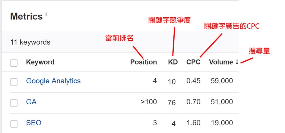 通常這些關鍵字研究的工具,會針對關鍵字,給予我們一些指標數據,常見的指標數據為: