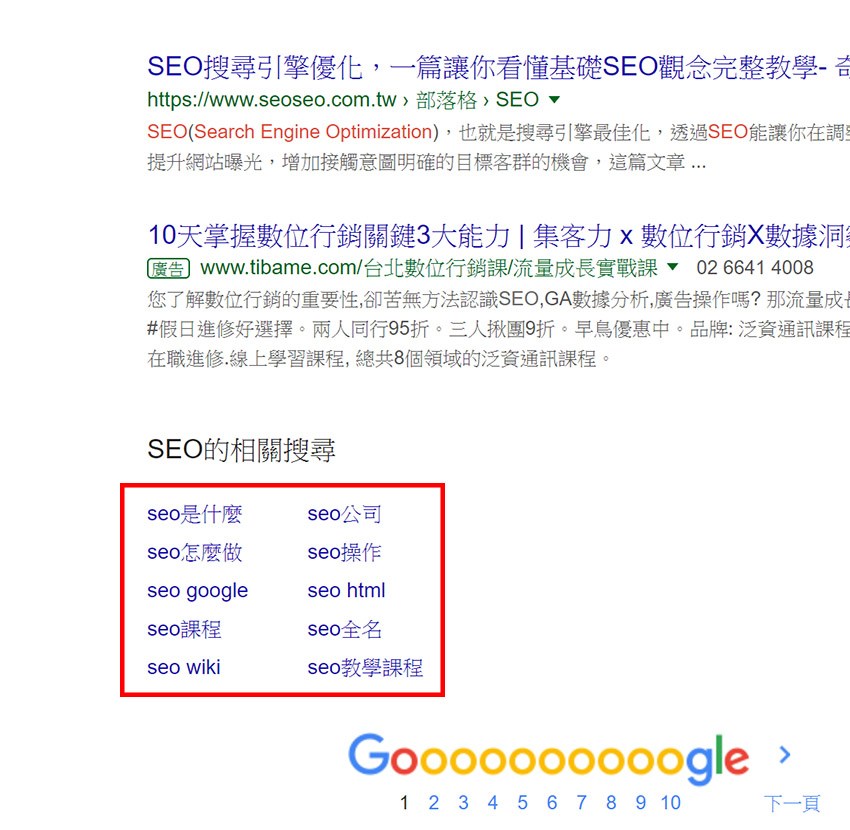 同時,除了搜尋建議之外,搜尋結果底部的"相關搜尋區塊"也是同樣的運作原理,Google會將最多人搜尋的關鍵字列在搜尋結果的底部(如下圖),這也是我們發掘更多關鍵字機會的地方。