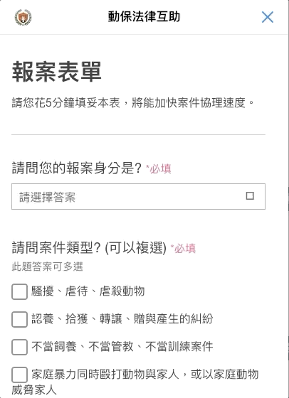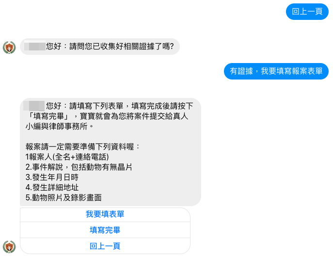 此為動保法律互助聊天機器人2.0版本中,使用CHATISFY表單功能的操作畫面