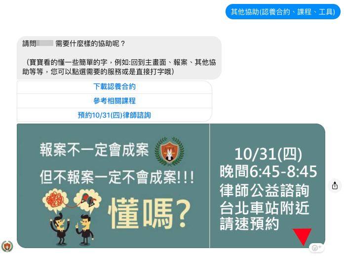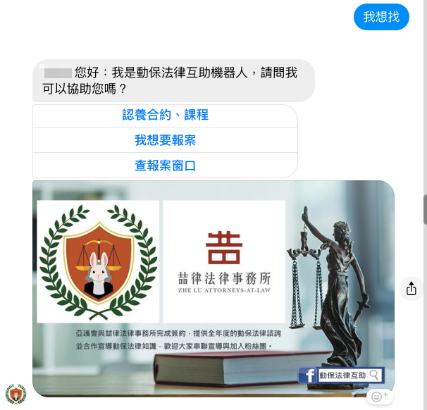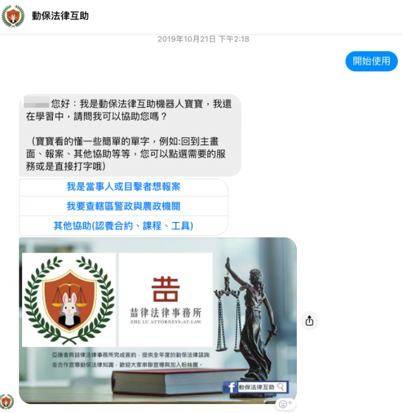 CHATISFY亦在7月中旬協助「配對」,尋人來幫助動保法律互助設立該粉絲專頁的聊天機器人。
