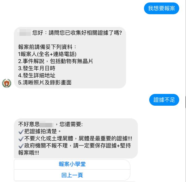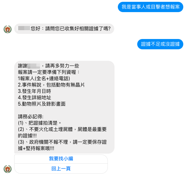 現在,透過聊天機器人的協助,可引導使用者依其需求至不同對話流程,並在後台篩去重複的報案內容,有效辨別案件的輕重緩急,將時間分配到有真正急需介入協助的動物案件。