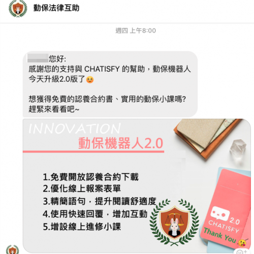 CHATISFY很開心這次能協助動保法律互助在社團裡完成「配對」,並在一個月內就將機器人以非常有效率的方式上線,有機會讓更多的使用者,透過聊天機器人的助攻,更認識動物保護法和動物權益的重要性。