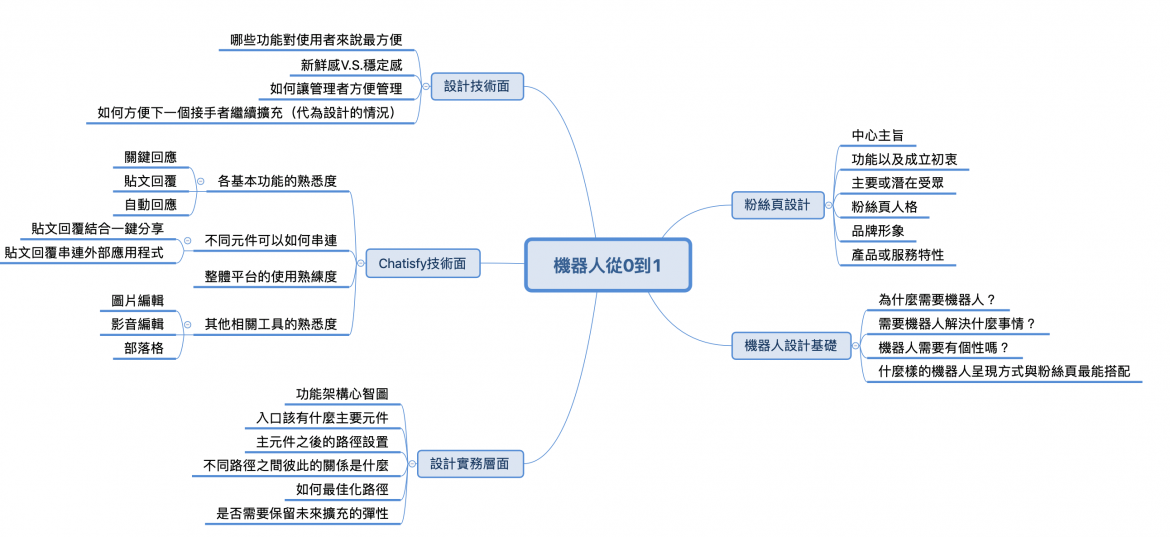 在訪談的過程中,我們也請張義平根據此次合作及其經驗,給予未來想要設計聊天機器人的小編、組織,從零到一設計心法及需注意的事項,並輔以心智圖架構作為說明。