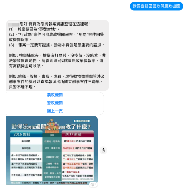 在訪談後的兩天,湘敏立即將做好2.0的設計,而且馬上上線!(點擊連結,開始與動保法律互助聊天機器人對話)