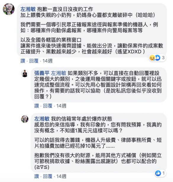 對左湘敏來說,此次與張義平一起打造出全國第一支動保機器人(動保法律互助機器人1.0)的合作十分成功,並比她期待機器人能做到的事情更多,她開心地露出笑容說:「每天終於可以睡5個小時了!」
