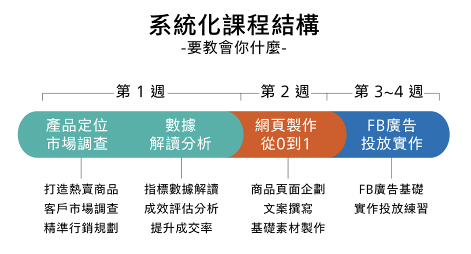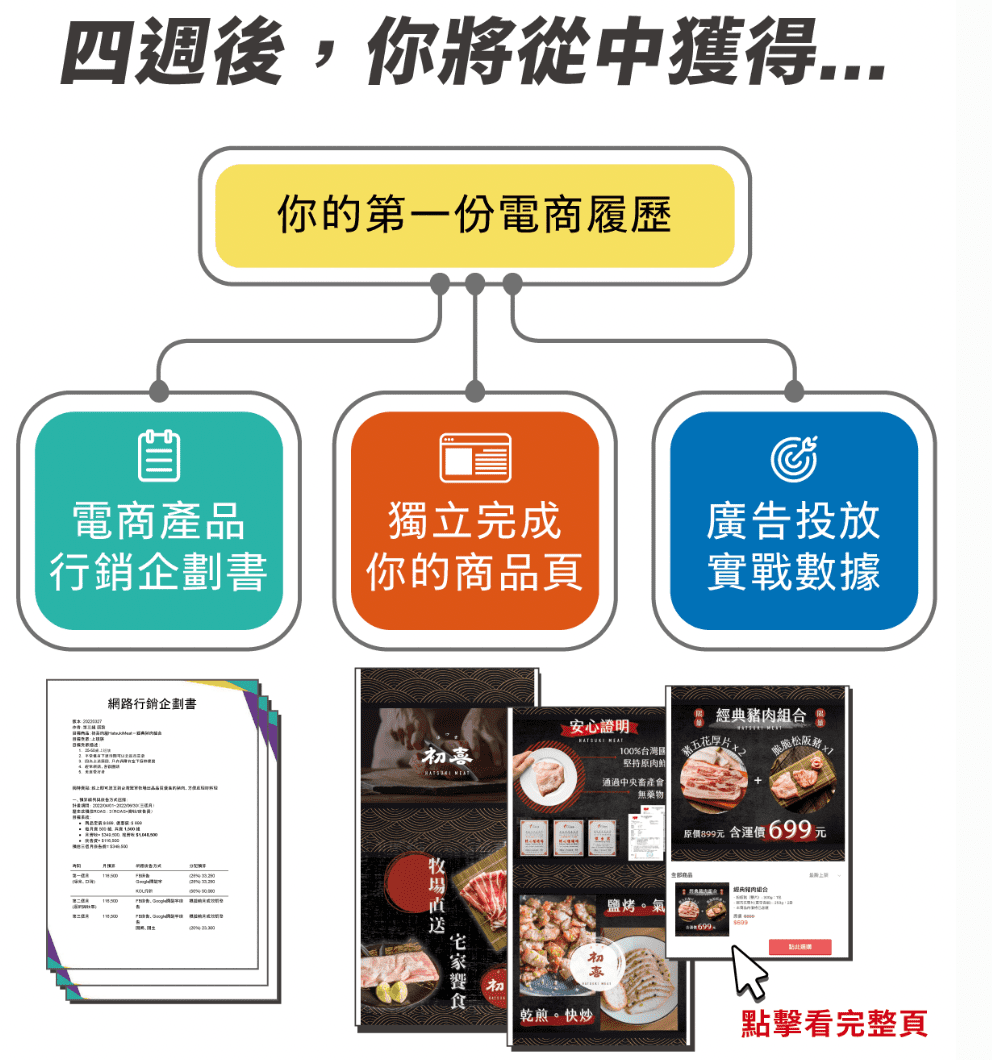 電商行銷基礎學程帶你實際從行銷企劃、產出銷售頁面、操作FB廣告、到實際投放,並累積成一份作品集。