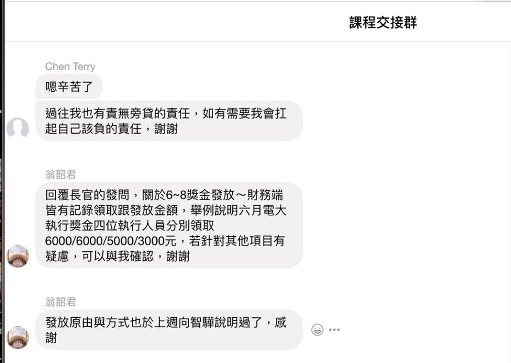 - 2018/10/8 在交接群組上指責我們亂發「獎金」給自己。