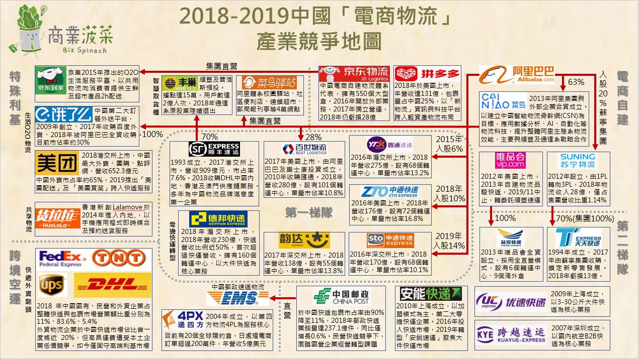 其中特別值得注意的是,電商龍頭阿里巴巴集團以雄厚資本力量為後盾,針對物流領域採取了大量入股策略,成為「四通」的主要股東,並以菜鳥網絡為核心,建立起智慧化物流網絡生態系。相對應的京東集團則選擇固守自建物流的重資本策略,2017年將京東物流獨立,開放承接外部物流業務,但目前仍陷於鉅額虧損中。