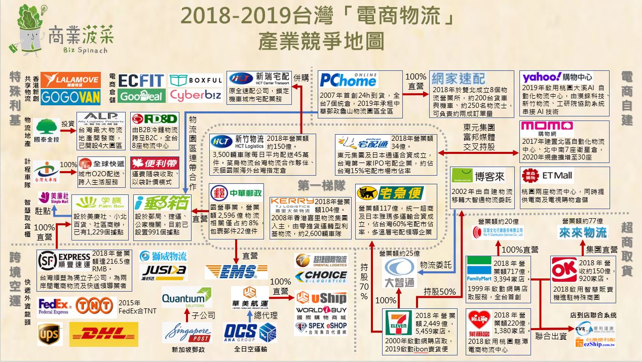 與全球趨勢相同,台灣大型零售與電商集團亦紛紛布局物流服務,集團化的競爭趨勢逐漸成形,例如統一流通次集團旗下大智通、統一速達、博客來電商及統一超店取;富邦媒體與東元集團交叉持股,旗下momo電商與台灣宅配通合作;PChome集團也進駐中華郵政物流園區,將合作「i郵箱取貨」服務共同上線。