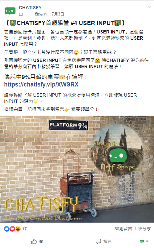 我們以「魔法世界霍格華茲」為題,形容這項功能如同魔法一般神奇且好用,將學員引導到 Messenger 進行一對一對話後,以「進行一個測驗」開始,讓學員在過程中親身體驗User Input的使用情境接著進行教學,並在學員學習完畢並與貼文互動後給予了特製專屬的「客製修業證書」為回饋。