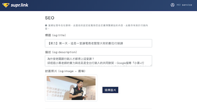 這段設定除了字面上「搜尋引擎優化」的用處以外。當網址發布在社群時,此區段的設定能幫助您自定義預覽網站的內容,如:FB的縮圖與標題說明。