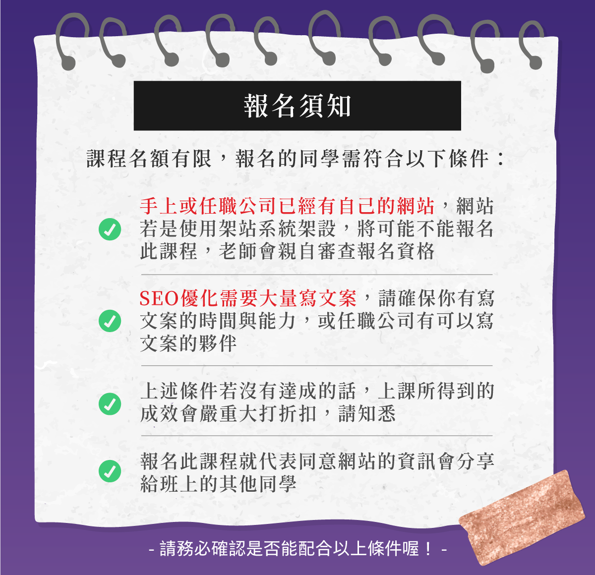 因本課程將於課中各別檢視官網後台資料,為保障同學公司機密與學習品質,此學程無回放影片,再煩請見諒。