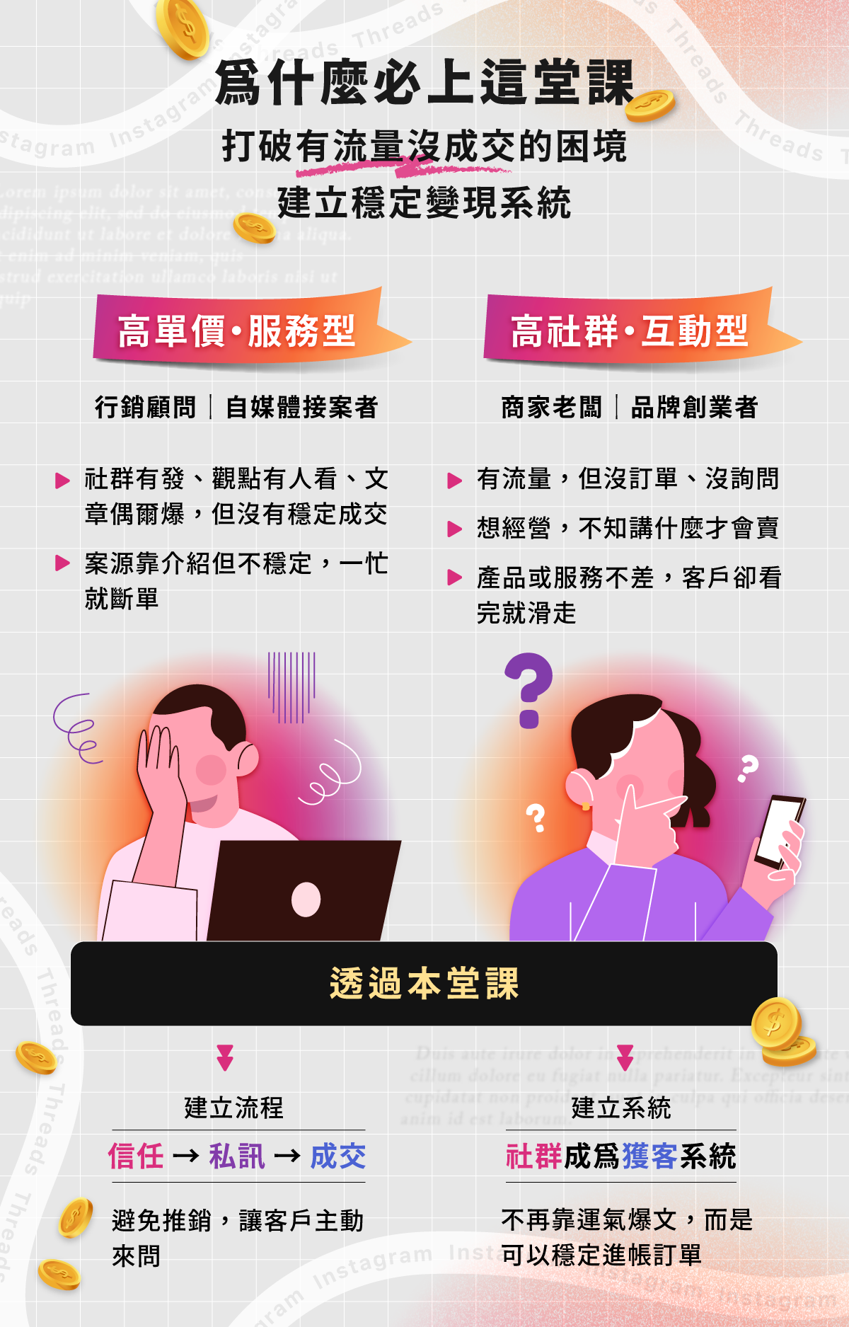 可以!課程核心是教「變現系統」,即使只用IG也能完整應用。Threads是加值內容,教你如何用更低成本建立信任感,但不是必要條件。