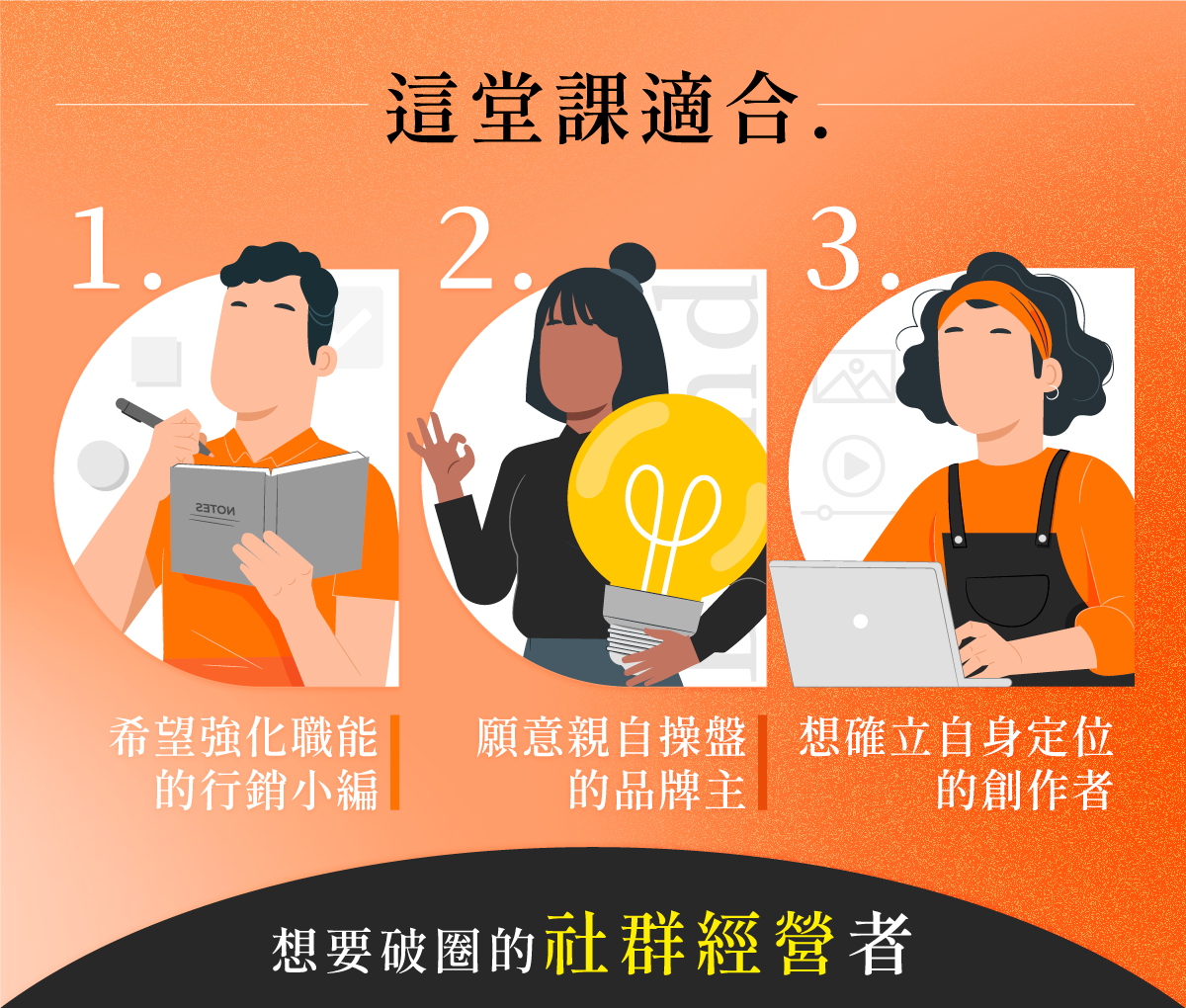 若為數位行銷實作課程,皆有電腦操作,需自備電腦及充電線。