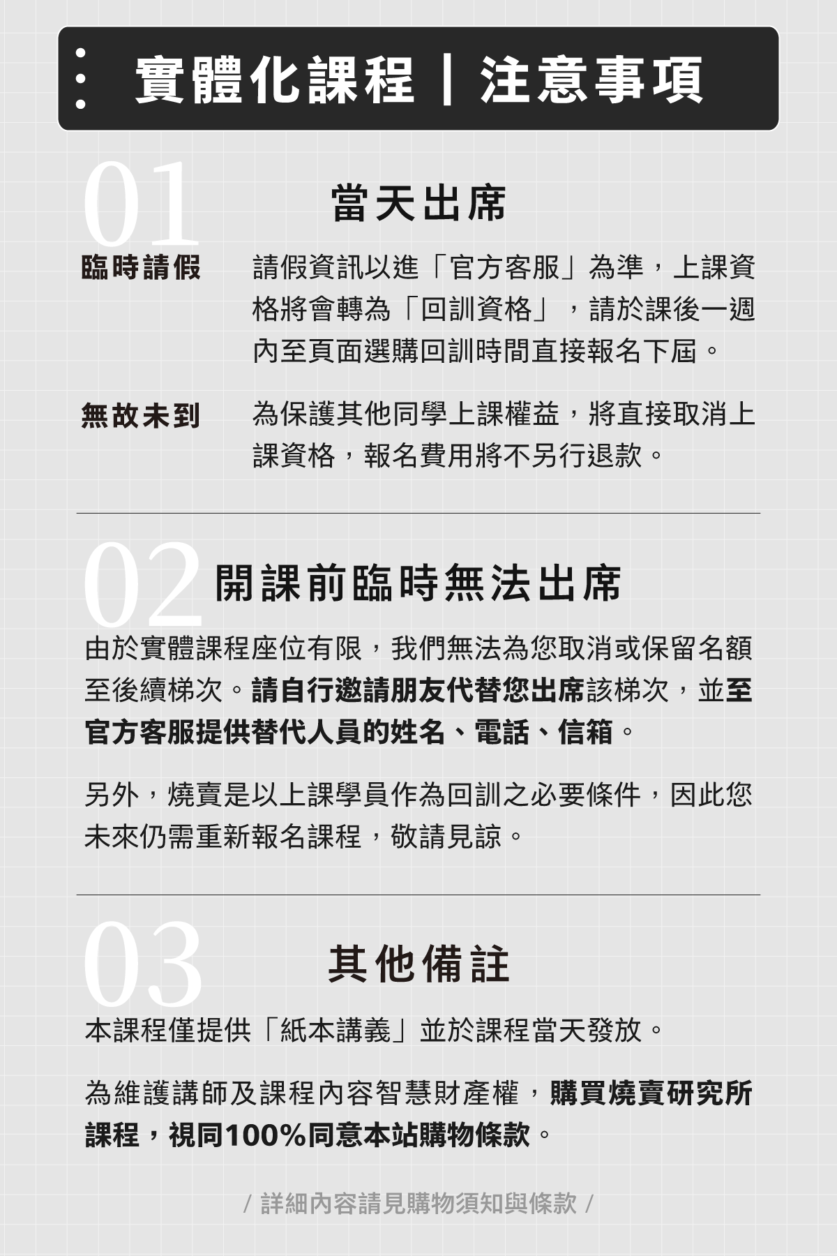 - 若回訓當日無法出席,須於三天前告知燒賣人員。若無故缺席,將取消未來回訓資格,敬請見諒。